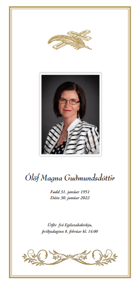 Útför Ólafar Mögnu Guðmundsdóttur verður gerð frá Egilsstaðakirkju þriðjudaginn 8. febrúar. Prestur sr. Hjálmar Jónsson. Organisti Jón Ólafur Sigurðsson. Félagar úr Kórakórnum syngja. Einsöngur Nanna Halldóra Imsland. Gítarleikur Friðrik Jónsson. Meðhjálpari Auður Anna Ingólfsdóttir.