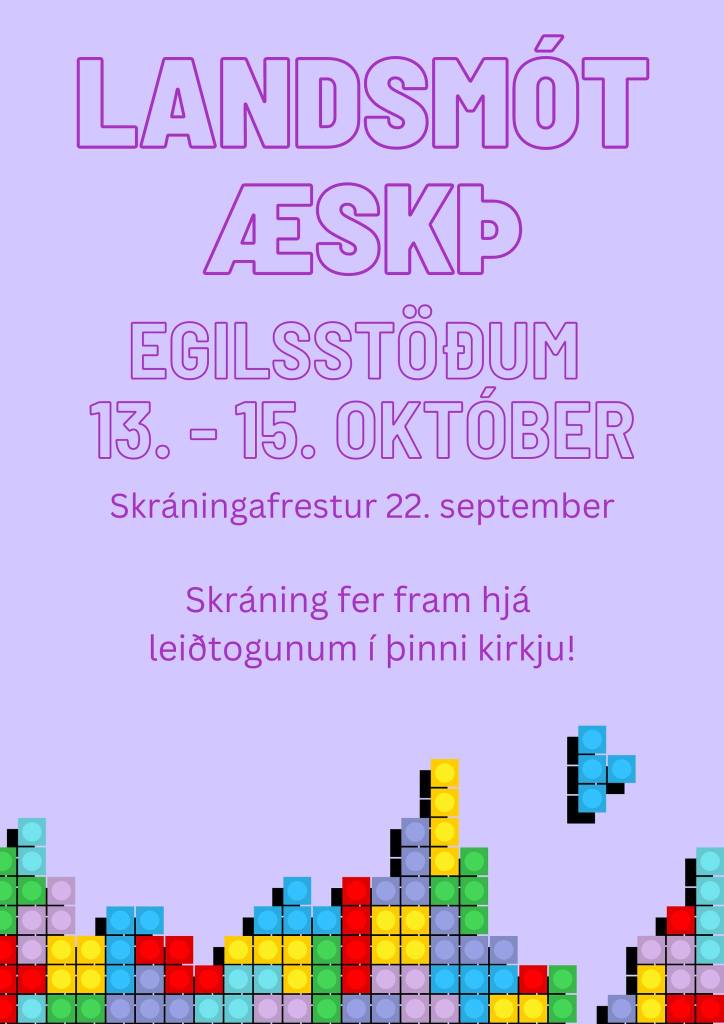 Helgina 13.-15. október fer Landsmót Æskulýðssambands Þjóðkirkjunnar fram á Egilsstöðum! Við eigum von á hátt í 200 unglingum og leiðtogum sem munu eiga góða samveru, gista í Egilsstaðaskóla og taka þátt í fjölbreyttri dagskrá í bænum yfir helgina, t.d. helgistundum, sundlaugarpartýi, smiðjum, „Messy Church,“ hæfileikakeppni, balli og fleiru. Helgihald næsta sunnudags 15. okt. í Egilsstaðaprestakalli verður með óvenjulegu sniði vegna Landsmótsins: