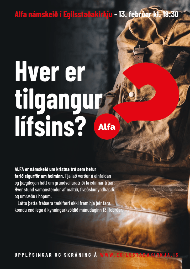 Alfa-námskeið verður haldið í Safnaðarheimili Egilsstaðakirkju á mánudögum kl. 18:30-20:30 á vorönn 2023. Hefst með ókeypis kynningarkvöldi 13. febrúar. Þetta er 8 skipta námskeið þar sem fjallað er á einfaldan og þægilegan hátt um grundvallaratriði kristinnar trúar í tengslum við stóru spurningarnar í lífi okkar.